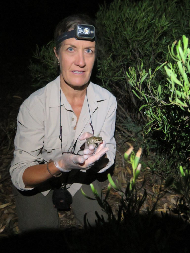 The visitor was the spotted-thighed frog, Litoria cyclorhyncha, which is native to south-west Western Australia and hence had to have crossed the dry Nullabor Plain. She learned that the frog had been transported and released in an artificial pond at Eucla in the 1990s. The species must also somehow gotten across from WA to Streaky Bay more recently – maybe as a hitch-hiker in luggage or a camper van or by being collected by kids (as tadpoles or adults) during a road trip and then released into the Streaky Bay Wetlands. Little was known about the frog’s diet in its home range.