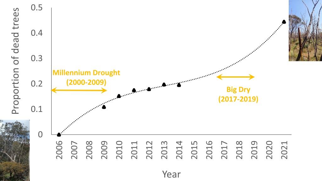 This catastrophic decline happened through two droughts (Fig. 3), the Millennium Drought (2000-2009) and the Big Dry (2017-2019) and, thanks to the foresight of the Department of Environment and Water that permanently marked more than 400 trees after dieback was first reported in 2007, we were able to document the progress of dieback. During the Millennium Drought, sites that had more marginal growing conditions for red stringybark trees were seemingly most severely impacted by dieback, while sites subject to the greatest heat-stress were most susceptible during the Big Dry.