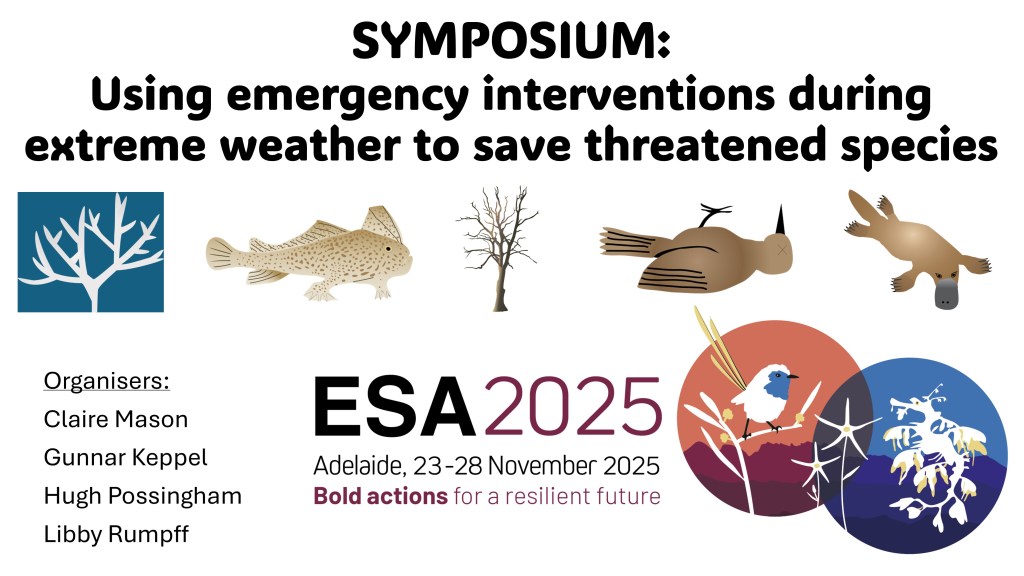 Recognizing the importance of raising awareness about the need to account for the possibility of ecological catastrophes and for planning emergency interventions for threatened biodiversity, we are organizing a symposium on the topic (Figure 1) at the next meeting of the Ecological Society of Australia (ESA 2025). Our organising team for the symposium includes Claire Mason, Gunnar Keppel, Hugh Possingham, and Libby Rumpff. It will focus on emergency interventions that are implement before, during, or immediately after a catastrophic ecological event. The symposium will bring together researchers and practitioners who have started to work on identifying potential emergency interventions for extreme ecological events. The goal is to summarise current practices and to lay the foundation for integrating emergency interventions in conservation planning under climate change.